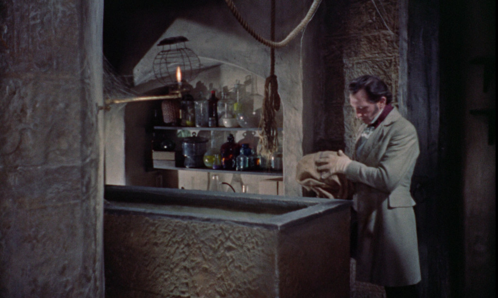 Terence Fisher’s handling of colour in The Curse of Frankenstein is far removed from the murky shadows of horror movies past. While the reigning philosophy of horror films had previously been to enshroud the viewer in darkness and mystery, often letting the audience’s imagination dream up the horrors of the story, Fisher and cinematographer Jack Asher choose the opposite approach. Fisher’s sets are brightly lit, with vivid, sharp colours, highlighting the movie’s Grand Guignol inspiration. When Frankenstein shops for eyes at the local charnel house, Fisher serves up a pair of real, sloppy eyes (hopefully from an animal) and at another time gives us a pair of dismembered hands in pale, fleshy tones. In a third scene, we see Frankenstein picking glass shards from a red, gelatinous brain. The unnaturally bright colour of blood as Frenke shoots the creature in the face pops out in a shock effect at the viewer. We don’t actually see any surgery, but the camera lingers on Cushing’s focused features as he goes about his business with various tools, forcing the audience to imagine what lies beyond the camera’s reach.