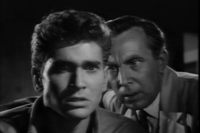 The rest of the cast is made up of either reliable supporting and bit-part players or youngsters with rather few film credits. Barney Philips, playing the sympathetic police detective, had a long and prolific career in TV and film, and is perhaps best known as the Martian bartender in the Twilight Zone episode “Will the Real Martian Please Stand Up”. Ken Miller, the singer of the awful song in I Was a Teenage Werewolf, actually did have a minor career as a recording artists, with singles like “Take My Tip” and “Teenage Bill of Rights”. While serving in Germany in 1954, he appeared in the German low-budget series Flash Gordon. He also appeared in I Was a Teenage Werewolf (1957) and Attack of the Puppet People (1958, review), and was first-billed in the low-budget SF comedy It Came from Trafalgar (2009).