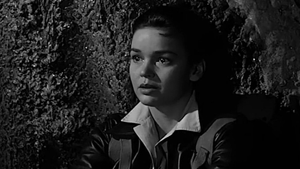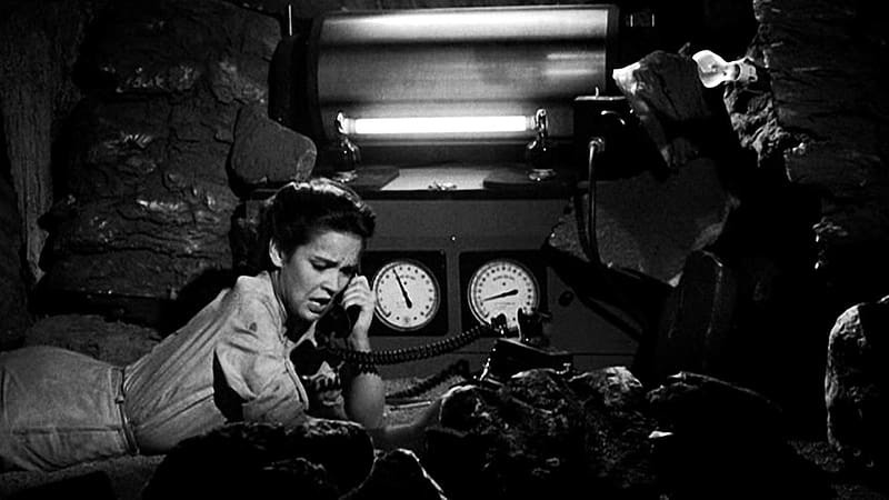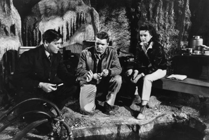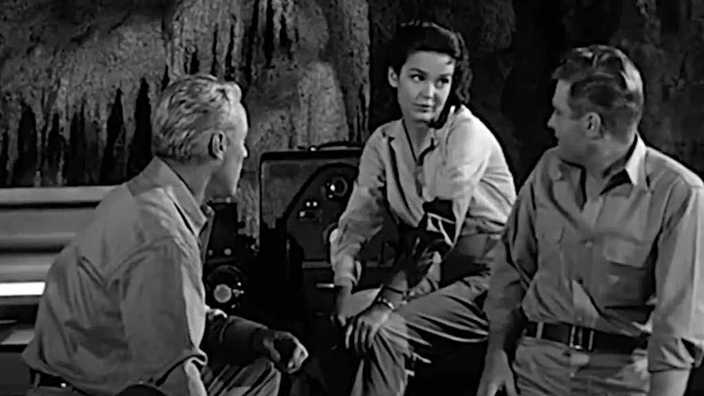The romantic subplot is, as usual, tacked on and redundant. There’s also a lot of talk about Brad, whom Hutch is going to marry, but we never see the guy. When Conway and Hutch finally get together, it turns out all she needed to do was say the word. The film is one of the many 50’s B-movies that tries to be feminist in a sort of backwards way. Hutch is described as a brilliant scientist and an invaluable member of the team, and she never backs away from danger. When a cave collapses around her, she doesn’t panic, but keeps reading out important measurements from the “pressure photometer”. But then there’s also a scene in which Hutch freezes when climbing down a rope ladder, and Conway has to talk to her like a child in order to get her down the cave shaft.