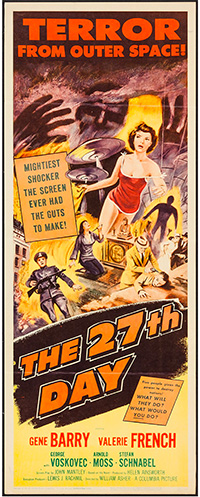 The 27th Day. 1957, USA. Directed by William Asher. Written by John Mantley & Robert Fresco. Starring: Gene Barry, Valerie French, George Voskovec, Azemat Janti Arnold Moss, Stefan Schnabel, Maria Tsien, Friedrich von Lebedur, Paul Birch, Ralph Clanton, Paul Frees. Music: Mischa Bakaleinikoff. Cinematography: Henry Freulich. Editing: Jerome Thoms. Art direction: Ross Bellah. Sound: Ferrol Redd. Produced by Helen Ainsworth for Romson Productions & Columbia.