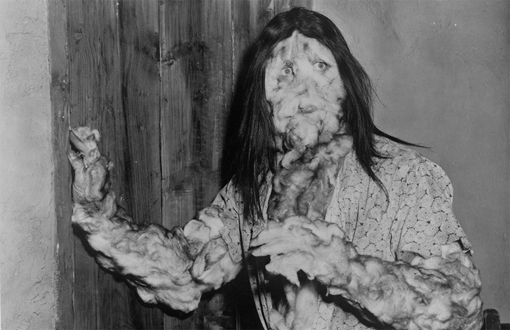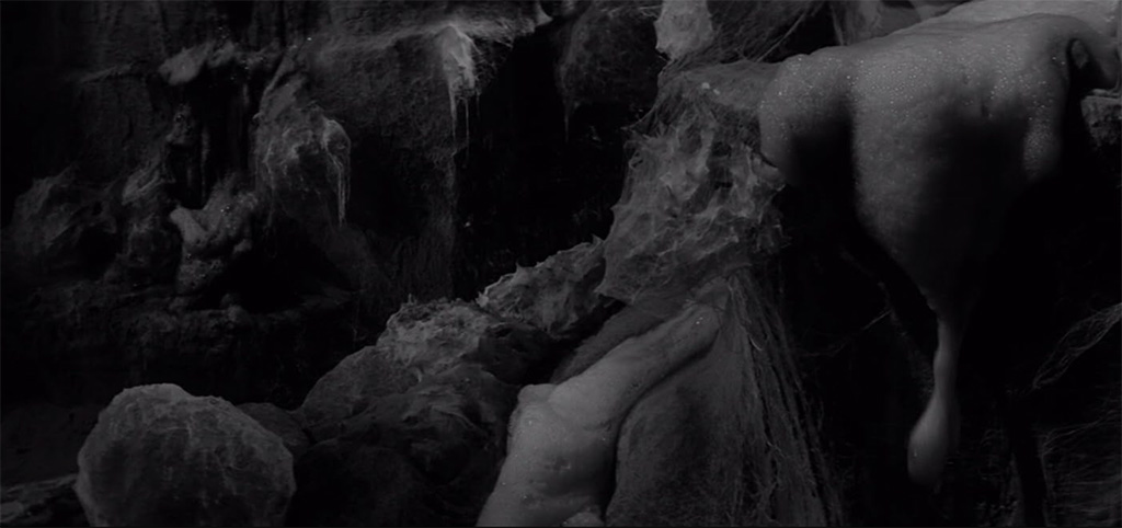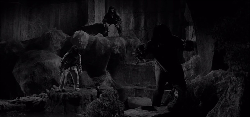 The special effects in the movie are limited to the fungus and the fungus monsters. The monsters are mostly shown in wide shots or kept in darkness, so watching the film, it’s quite hard to pin down what they actually look like. However, both Mala Powers and John Howard tell Tom Weaver that they thought the monsters were ridiculously bad – the makeup people simply covered the actors with cotton and spirit gum, which is clearly corroborated by production photographs. Powers tells Weaver that the fungus cascading down the cave walls were soap suds “and some kind of plastic goo”. According to Powers “it was quite effective”. Howard says he thought it was ridiculous, and wouldn’t scare anyone. However, “it sure frightened the hell out of my kids – they were scared to death! So if all the movie set out to do was scare young people, I guess it worked!”