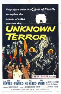 The Unknown Terror. 1957, USA. Directed by Charles Marquis Warren. Written by Kenneth Higgins. Starring: John Howard, Mala Powers, Paul Richards, Gerald Milton, Mae Wynn, Duane Grey, Richard Gilden, Martin Garralaga, Patrick O’Moore, William Hamel, Charles H. Gray, Charles Postal, Sir Lancelot. Music: Rauol Kraushaar, Dave Kahn. Cinematography: Joseph Biroc. Editing: Michael Luciano. Production design: James Sullivan. Makeup: Glen Alden. Sound: Hugh McDowell, Jr. Special effects: Norman Breedlove. Visual effects: Jack Rabin, Louis DeWitt. Produced by Robert Stapler for Emirau Productions, Regal Films and Twentieth Century-Fox.