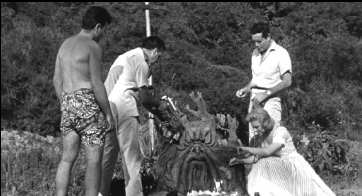 The end result includes Blaisdell’s trademark evil frown, but lacks the spiky, leathery appearance of most of his designs. If one took away the frown, one wouldn’t immediately identify it as a Blaisdell design, which, of course, it wasn’t. When immobile, the monster doesn’t look half bad — it sort of resembles some kind of totem creature carved out of wood. However, as soon as it starts wobbling its way through the jungle, it is prone to induce more laughter than terror. Of course, the concept of a murderous tree stump is laughable in and of itself, and when the end result is clearly a stuntman struggling to move in an awkwardly restrictive rubber suit, you think more of the poor sod stuck inside the thing than about whether the monster is going to kill any of the inconsequential characters of the movie. That poor sod’s name was Chester Hayes, a tall, burly bit-part actor who is only remembered today for this very role.