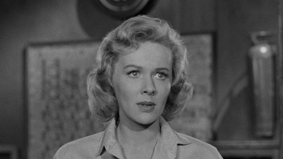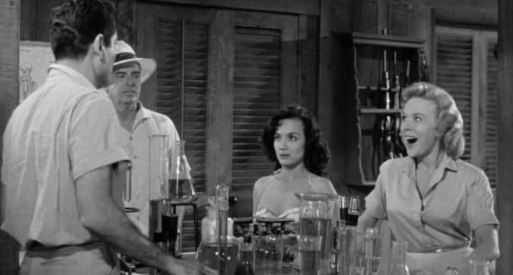The romance plot is combined with the trite “women can’t be scientists” trope. Of course, by this day and age many women were scientists, some of them famous ones. So the screenwriters in 50’s movies couldn’t claim women couldn’t be scientists because of any lack in intellect. Instead, the trope — that might very well have been established in Rocketship X-M (1950, review) — that 50’s screenwriters fell back on was that you couldn’t be “all woman” and scientist at the same time. That somehow, using your grey matter for solving scientific problems in your work prevented you from having emotions, dating, being feminine, getting married, having children, being happy in your personal life — or really even from having a personal life at all. It is never explained why this doesn’t also apply to men.