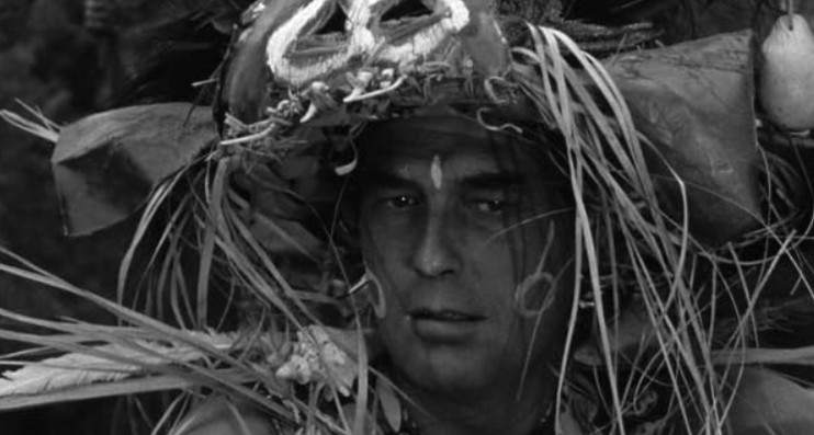 After the opening crawl, we jump straight into the execution of prince Kimo (Gregg Palmer), accused bringing about the death of his father the chief by allowing the white men to give him bad medicine for a disease caused by the devil dust. This is all a ruse conctocted by medicine man Tano (Robert Swan), the new would-be chief Maranka (Baynes Barron) and Kimo’s double-crossing wife Korey (Suzanne Ridgeway) to seize power. Before he is stabbed to the heart, Kimo vows to return and avenge himself (or as the screenplay puts it, revenge himself). He is then buried standing up in a wooden box (not in a tree trunk, as the opening crawl would suggest).