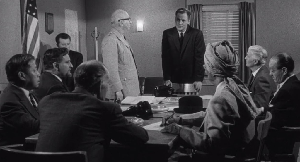 Unfortunately, Ray Buffum wasn’t the strongest of screenwriters, and the original premise is played out in a rather conventional way. The nuclear testing doesn’t play any part in the plot, but since the the threat of nuclear war was a staple in science fiction, it seems Marquette and Buffum just wanted to cram that in there too. The story is also hampered by its limited budget. Much of the film is played out at the Bronson Caverns, a favourite spot for low-budget filmmakers in Hollywood, and much of the rest at Marquette’s optometrist neighbour’s house (“he had a bigger house than we had”) and backyard, and some shots are done at Marquette’s house. The scenes with the meeting of the US military and the leaders of the world look like they could be filmed at an actual studio, but it might also be Marquette’s neighbour’s house. There’s enough backyard shooting and shots at remote roads in the hills that the film doesn’t feel too cramped, probably done guerilla style. But the limited sets also limits the story, and severely limits the menace presented by Gor. If he is invuneralble and can blow up the Earth with the power of his mind, why all the need for infiltration and secrecy?