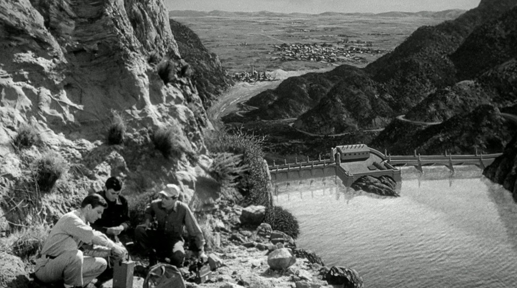 The rain eventually stops, and the weatherman (William Schallert in a fun cameo) forecasts two days of sunshine. That’s how long Dave and Flanders have to figure out how to stop the monolith monsters. Or actually, less than that, as the crystal menace continues to grow despite the rain stopping – it keeps drawing moisture from the ground. The two geologists test every combination they can think of in Dr. Hendricks’ serum, but nothing seems to be able to halt the growth in the rocks. Until Dave remembers that Hendricks mentioned that he diluted the serum with a saline solution. And lo and behold! Salt water seems to do the trick. Luckily for Dave, the small town operates a salt mine, which so happens to be next to the opening of the ravine in which the monoliths are advancing, and also just so happens to be next to a dam. The only way to stop the monsters, Dave figures, is to blow the dam and let the water flow over the salt mine, and into the ravine where it will stop the advance of the monstrous rocks. But for blowing the dam, they need permission from the governor – and he ain’t answering his phone …