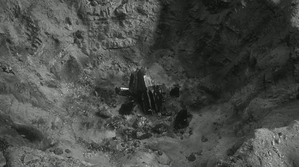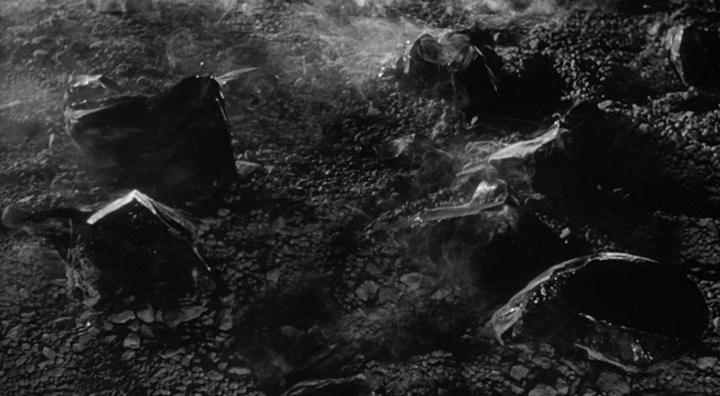A shot of a meteor in the beginning of the film is reused footage of the opening shot of It Came from Outer Space – possibly magnesium or some other quickly burning material inside a spherical metal cage. William Alland had encouraged Universal to save money on effects costs by utilising stock footage – pointing to Columbia’s success with the same formula. The Monolith Monsters does use some stock footage of explosions, flooding and whatnot, but it is well incorporated into the film.