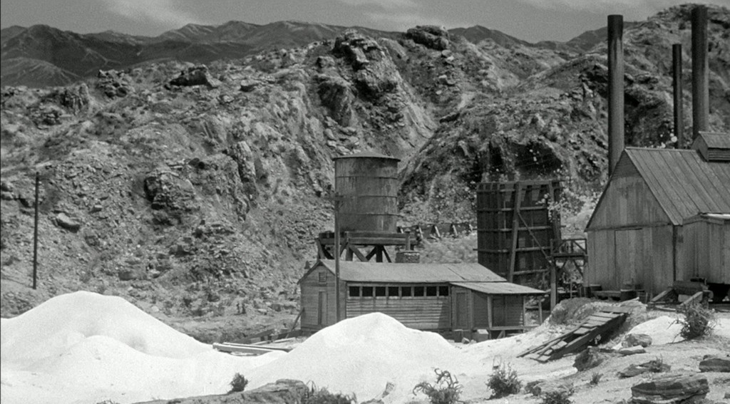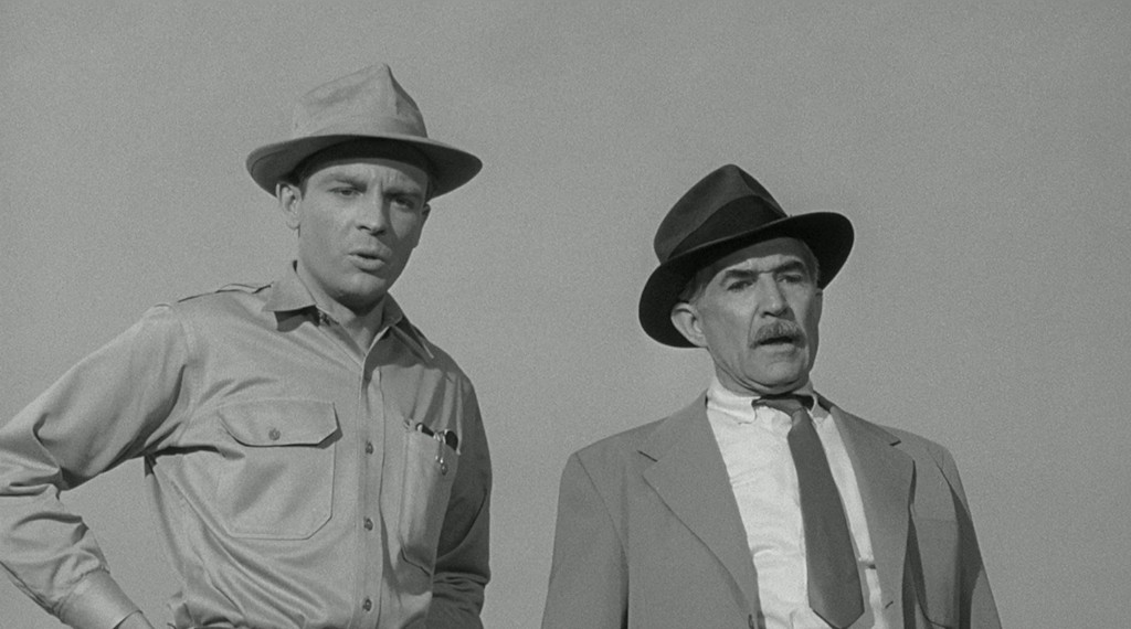 Tom Weaver laments that so much focus is put on the fate of little Ginny, while the world is theatened by the growing rocks. I disagree. The strength of The Monolith Monsters is that the threat is human-size. By focusing on the girl, the film gets an emotional anchor. And really, the movie is not about saving the world, but about saving a town. There’s a paradox about these kinds of movies that the more there is at stake, the less the audience cares. We all know that the Monolith Monsters are not going to destroy the Earth, so we don’t worry about that. But they may very well destroy the town – or kill a girl. That’s something we can invest in. Yes, the film also talks about the what happens if they don’t stop the rocks from growing and that they may threaten the world, but that’s actually unnecesary.