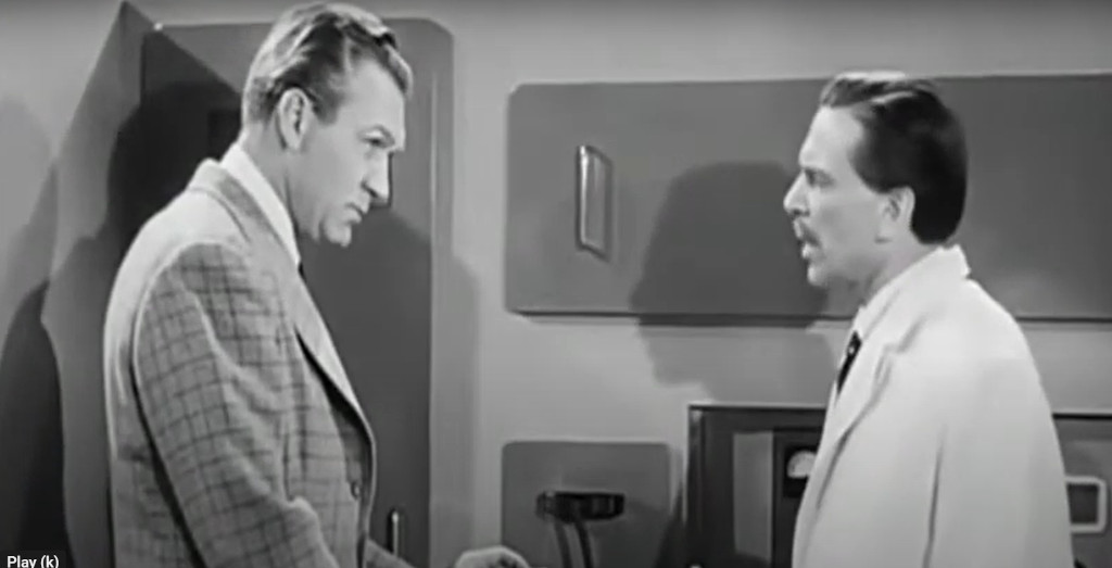 Later, Smith explains that he comes (surprise, surprise) from a distant planet, one which the tabloid press has named “Planet X”, and that they have been monitoring Earth for a long time. He is here to warn Earth about Laird’s experiments, which are not only dangerous for Earth, but also upsets Earth’s magnetic field, which the aliens’ flying saucers are using for navigation when watching over the planet. He also tells the Earthlings that the aliens have now neutralised all giant insects. Upon learning all this new information, Gerald races to Laird’s lab, intending to close down the experiments. But Laird will not hear of it, and shoots Gerald. However, before dying, Gerald manages to phone for help. The G-men, Gil and Michelle arrive with Mr. Smith. Smith explains that ge can blow up Laird’s lab with Laird inside, but the decision must be taken by the Earthlings present: to sacrifice the life of one individual for the sake of the common good…
