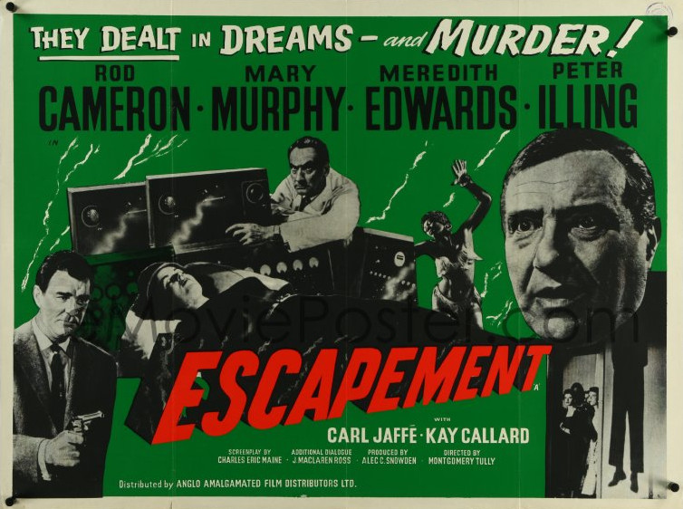 Escapement. 1958, UK. Directed by Montgomery Tully. Written by Charles Eric Maine, J. McLaren Ross. Based on the novel Escapement by Charles Eric Maine. Starring: Rod Cameron, Mary Murphy, Meredith Edwards, Peter Illing, Carl Jaffe, Kay Kallard, Carl Duering, Roberta Huby, Felix Felton, Larry Cross, Jacques Cey, Alan Gifford. Assistant director: David Paltenghi. Cinematography: Bert Mason. Editing: Geoffrey Muller. Art direction: C. Wilfred Arnold. Makeup: Jack Craig. Sound editor: Derek Holding. Musical director: Richard Taylor. Electronic music: John Simmons. Produced by Alec Snowden for Anglo-Guild Productions.