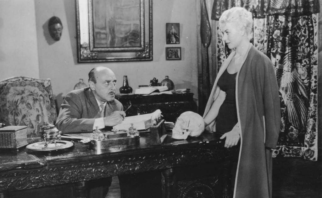 The only thing, really, holding the film together are the actors. George Coulouris had shown in The Man Without a Body that he could elevate a batty script with his integrity and energy, and he does the same with Womaneater, even if he has far less to work with in this movie. Coulouris brings a jumpy, frantic energy to the driven, paranoid Moran, dashing and rushing to and fro, as if he knew the film needed a boost. He gets good support from Vera Day who chirps her way through her role in a competent manner, given her airheaded character. The rest of the cast is decent enough, given the circumstances. Peter Forbes-Robertson (billed as Peter Wayn) is fine in the “romantic” lead, considering his impossible role, and there’s nothing wrong with Joyce Gregg as Margaret either. Jimmy Vaughn, whose only credited film role this was, was probably cast for his “exotic” looks rather than any previous acting experience. He is not particularly good, but his role is such a stereotype that he is able to bring it home thanks to a sincere effort.
