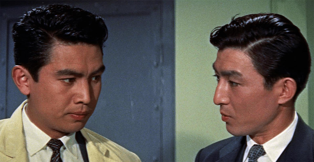 All this is not enough to sink the film, but it does make it a bit of a slog. As do the over-long musical and dance interludes that seem to have been ubiquitous to Japanese gangster movies, and thus also to the crossover films. Here Chikako Arai performs two mellow, smoky jazz numbers in a deep husky voice that differs significantly from actress Yumi Shirakawa’s speaking voice. Shirakawa mouths the songs skilfully, but the voice is that of jazz star Martha Miyake. Likewise, the film offers up two fairly lengthy exotic dance numbers, with actress Ayumi Sonoda in the spotlight. I can understand that these numbers were expected by the audiences of the popular noir genre in Japan, and they are all quite well executed, but they have no dramatic value and only serve to grind to story to a halt. However, the jazz band is KILLING IT! It’s worth noting that the jazz songs were written by the film’s composer Masaru Sato.
