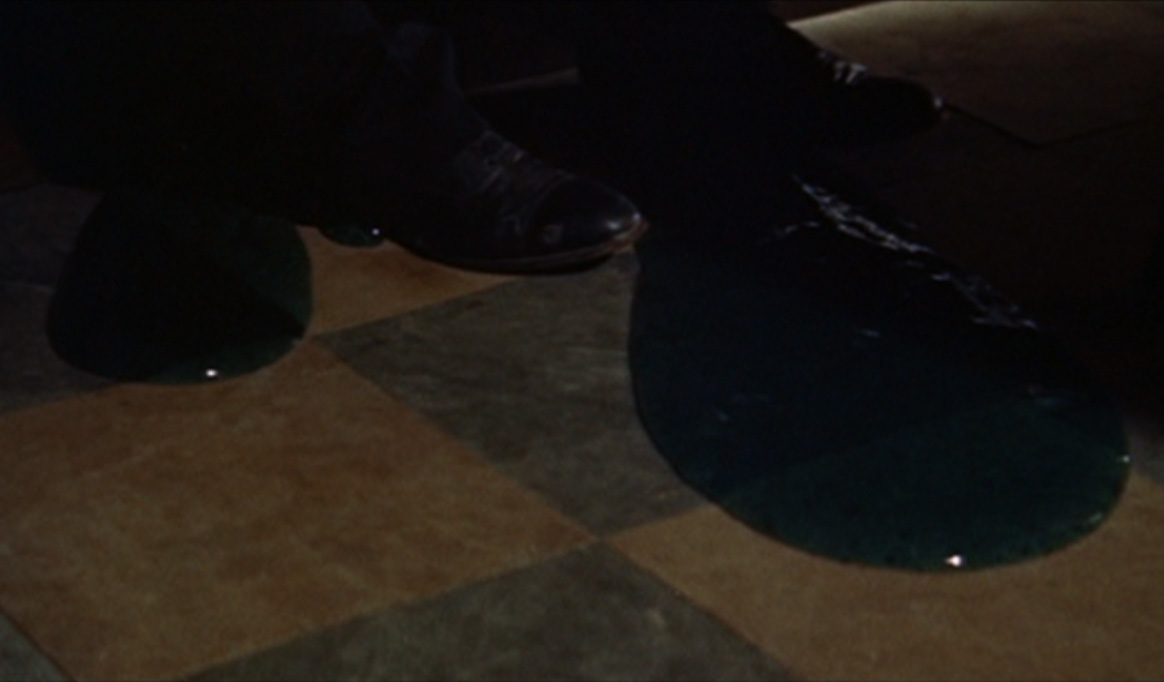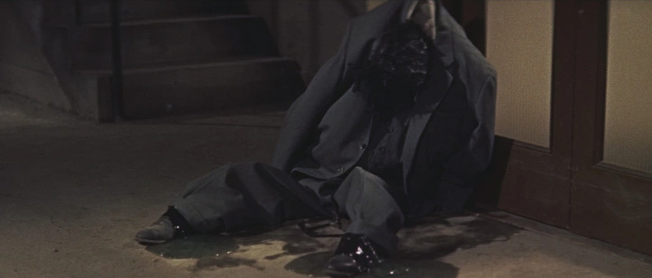 The music of the film is a somewhat mixed and eclectic bag. Masaru Sato happily combines styles that clash jarringly with each other. The most egregious theme is an upbeat and way too imposing military march which is first heard in the beginning of the movie, and which makes a couple of returns in scenes where we are gearing up for a dramatic climax. This theme seems completely out of sync with the movie’s dark, noirish style. Then there’s the jazz parts, which are good on their own and certainly sets the mood for the club scenes, but that take up way too much space in the film. Most of the soundtrack has a lot more subdued, sometimes almost electronic sounding music, using instruments like a saw and a glass harp to create otherworldly sounds, fitting both the SF horror atmosphere and the noir style.