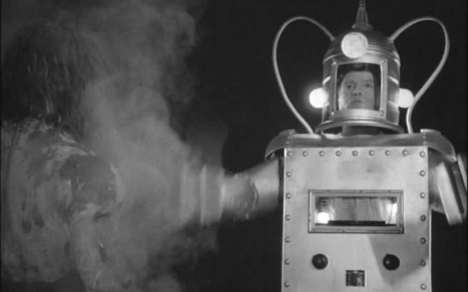 The one thing that makes this film, and its robot, interesting from a historical point of view, is that it marks (perhaps) the appearance of cinema’s first cyborg. The history of cyborgs in fiction easily becomes confused, as terms like robot, android, bionic and cyborg are sometimes used interchangeably. According to a very unreliable Wikipedia list, the first fictional cyborg appeared in Samuel-Henri Berthoud’s short story Prestige in 1831, but since I haven’t read it or found any synopsis of it, I can’t vouch for the accuracy of this statement. However, the story that is generally considered as the one introducing the cyborg to popular consciousness is Edgar Allan Poe’s The Man That Was Used Up (1839), about a soldier so badly damaged during the campaigns against the Native Americans that he has to be assembled every day from prosthetics and mechanics. Like in Poe’s story, most early mentions of cyborgs in literature were humorous or satirical, and it wasn’t until around the 1920s that serious literature on the subject started appearing, by authors such as Maurice Renard, Francis Flagg and Edmond Hamilton. By the 50s, the concept was fairly commonplace in SF literature, but had yet to be explored on screen.