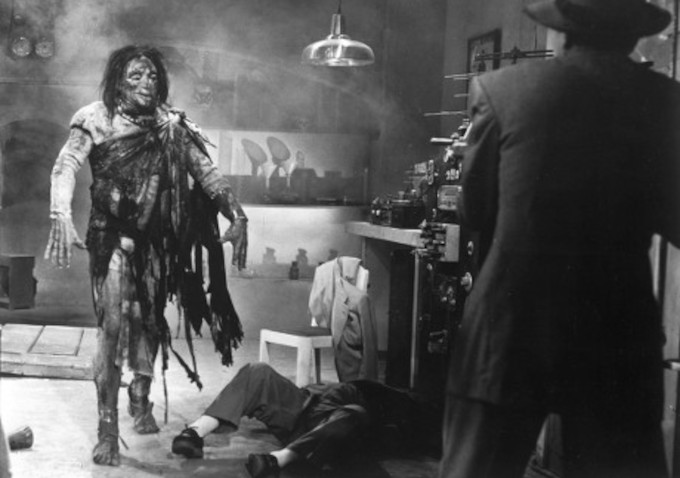 Inevitably, the plot is episodic, and especially during the first two thirds it grinds to a halt several times as we return to the sitting room where Almada narrates the recaps. The segments in between are often at least mildly engaging on their own, in the manner of 30s and 40s film serials, which is what this film mostly resembles, as is the case with many Mexican 50s action films. The short shooting schedule and low budget show in the filming: the movie is almost entirely shot in wide master shots and medium shots, with few cutaways, inserts or close-ups, and the cinematography is often static. The action scenes are hugely disappointing, considering the trilogy did involve a luchador hero (unfortunately cut from this movie). The brawls are completely without finesse, with opponents slugging each other in clumsy choreographies. The mummy does little more than hug people to death. The final fight between the robot and the mummy consists of awkward footage of two actors trying carefully not to destroy their fragile monster suits, resulting in something that mostly resembles slow-motion shoving match.