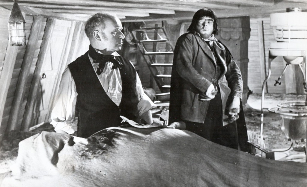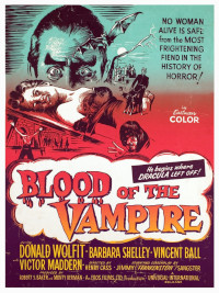Blood of the Vampire. 1958, UK. Directed by Henry Cass. Written by Jimmy Sangster. Starring: Donald Wolfit, Vincent Ball, Barbara Shelley, Victor Maddern, William Devlin, Andrew Faulds, John Le Mesurier, Bryan Coleman, Bernard Bresslaw, Milton Reid. Music: Stanley Black. Cinematography: Monty Berman. Editing: Douglas Myers. Art direction: John Elphick. Makeup: Jimmy Evans. Produced by Robert Baker & Monty Berman for Tempean Films.