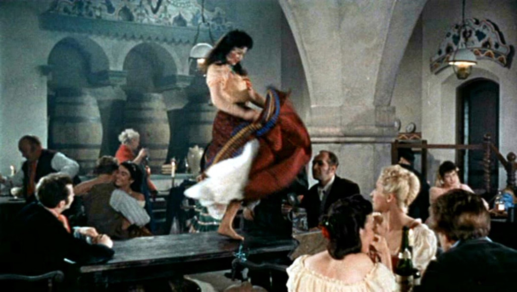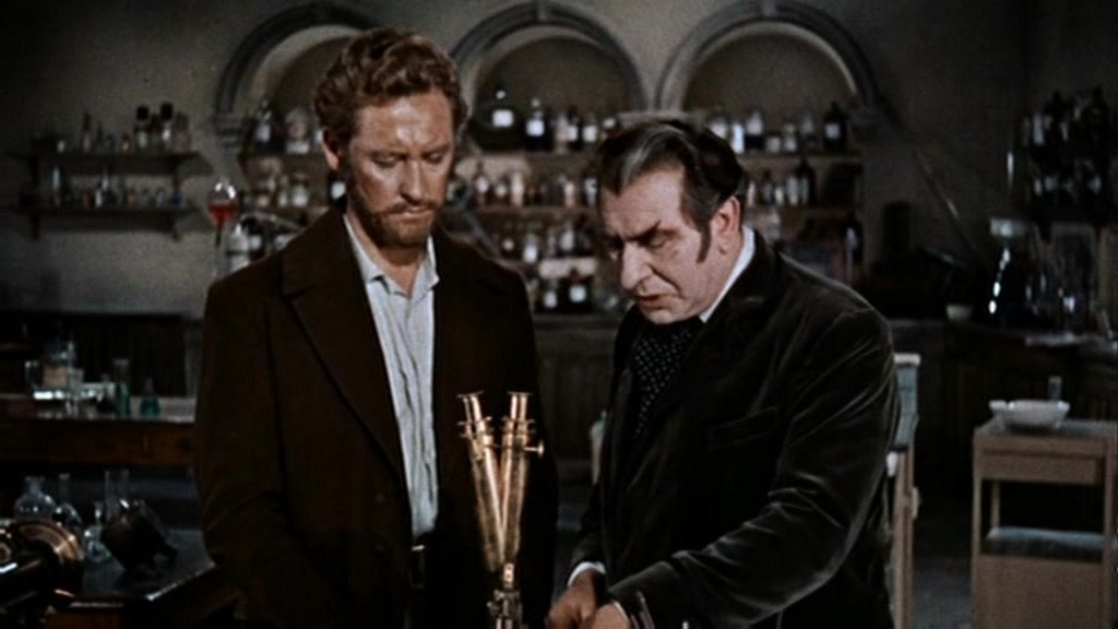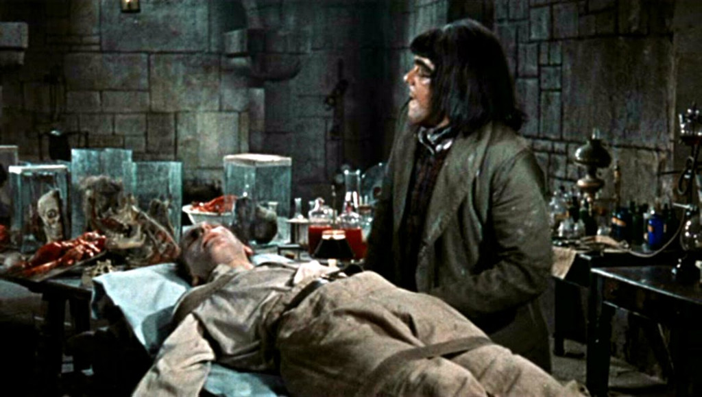 Whatever the case with the production companies, the producers went out of teir way to our-Hammer Hammer. Even the title emulates the Hammer formula in its “X of Y” setup. The setting is the same late 19th century Europan cityscape as in Hammer’s movies, with taverns, dungeons, opulent upper-class rooms and murky labs with colourful liquids bubbling in beakers reminiscent of Hammer’s pictures, all shot in the same lush colour as Hammer’s hit films.