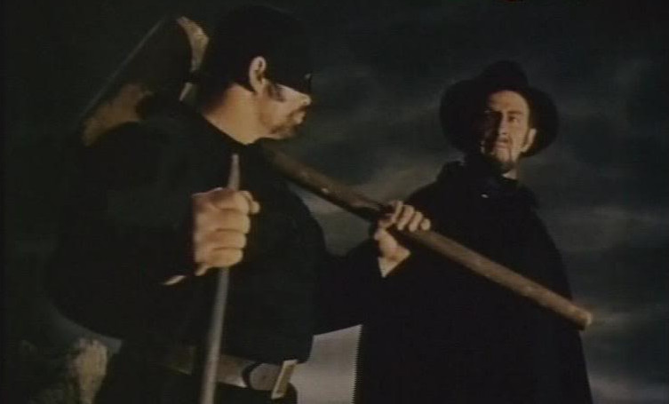 Art director John Elphick makes the most out of the small budget, making heavy use of matte paintings in order to fill out the world and continue small sets and rooms. The matte paintings are not necessarily life-like, and one could even call them crude, but in a film like this, which already deals in a world of heightened reality, something like a delirium, the obviously painted backdrops seem oddly approriate. Director Henry Cass had no experience with horror movies (despite Wikipedia erronously labelling him as “particularly prolific in film in the horror […] genre”), but does a fair job of emulating the the Hammer look, albeit with nothing of Terence Fisher’s sophistication. Many of the scenes fall visually flat, and Elphick’s art direction does much of the work for Cass. The film has a few shock moments, such as the graphic staking in the beginning of the film, as well as the almost comically gruesome makeup for Carl (especially memorable is his one eye that seems to be in the process of escaping down his face). But all in all, it is neither more nor less gory that the Hammer movies – which weren’t really that gory to begin with.