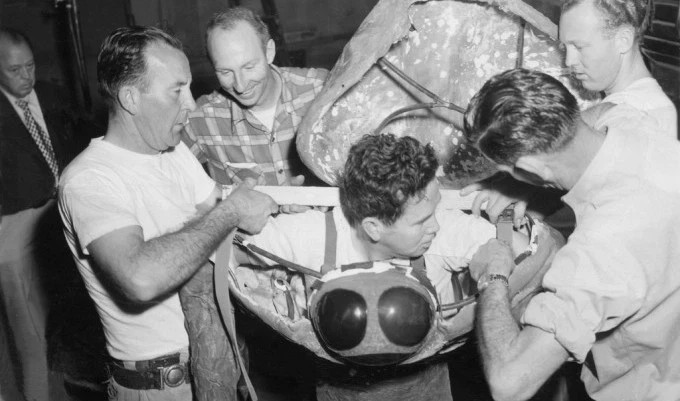 The monster actually looks rather good, both in its immobile plaster prop version, and as a costume worn by Bob Bryant. For It! The Terror from Beyond Space, producer Robert Kent called upon the services of AIP’s go-to monster maker Paul Blaisdell. For Curse of the Faceless Man he went to another special effects royalty: Charles Gemora. Gemora had been around since the silent era, as a carpenter, set dresser, makeup artists, stuntman, ape and suit actor and special effects designer, on both prestige classics and B-movies. Among other things, he created the Martians for The War of the Worlds (1953, review).