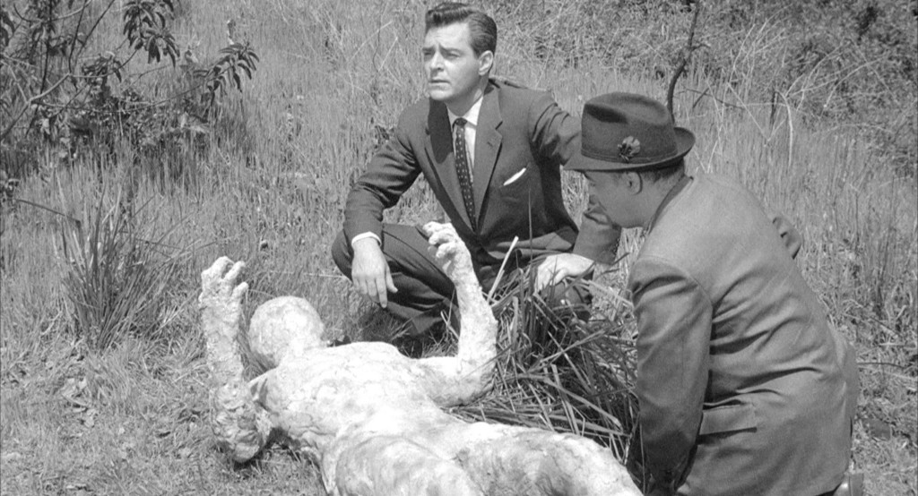 The inspiration for the monster is taken from the iconic displays of the victims of the Vesuvius eruption. Of course, the white “bodies” on display are not bodies at all – no Egyptian-style mummies remained in Pompeii, only bones. They are merely plaster casts of the hollows created by the calcified ash that covered the bodies, after the bodies themselves decomposed. But Gemora has skilfully recreated these motionless plaster casts, and the result is quite effective, both the plaster version and the suit, especially as it is filled out with the imposing body of Bob Bryant. While drawing heavily on the mummies of movies past, it is a rather original monster, something that was not a given in the low-budget movies of the late 50s. It is also very well by Cahn and cinematographer Kenneth Peach, creating a good deal of suspense and atmosphere. The sequences with the monster are the best in the film.