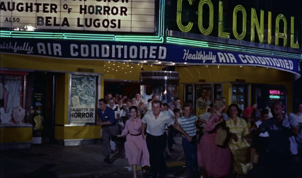 The direction by Irvin Yeaworth, Jr. also leaves much to be desired. Many scenes are shot only from one single direction, and and many shots are cropped tight to hide the lack of sets. In several instances, the actors are shot against black backdrops, making them feel oddly detached from reality, almost as if they were acting in a black box theatre. In the live action footage, most scenes are shot flatly and uninterestingly. One memorable exception is the scene in which the teenagers are fleeing the theatre, and the camera dynamically catches the kids from a frog perspective, in a shot that looks like hand held camera. However, this was reportedly, an accident, as the cameraman was knocked over by the running mob. This scene also showcases the way in which local townspeople were involved in filming. If you look at the faces of the running crowd, it’s not terror on their lips, instead most of them look happy and excited, laughing from ear to ear as they are allowed to take part in a movie shoot, dashing out from the cinema as they pretend to be escaping a monster. The film looks as good as it looks thanks to its special effects photography, and not thanks to the work done by Yeaworth. Of course, the colour and Paramount’s semi-wide 1.66:1 ratio does also lend the picture an air of class that it frankly doesn’t deserve.