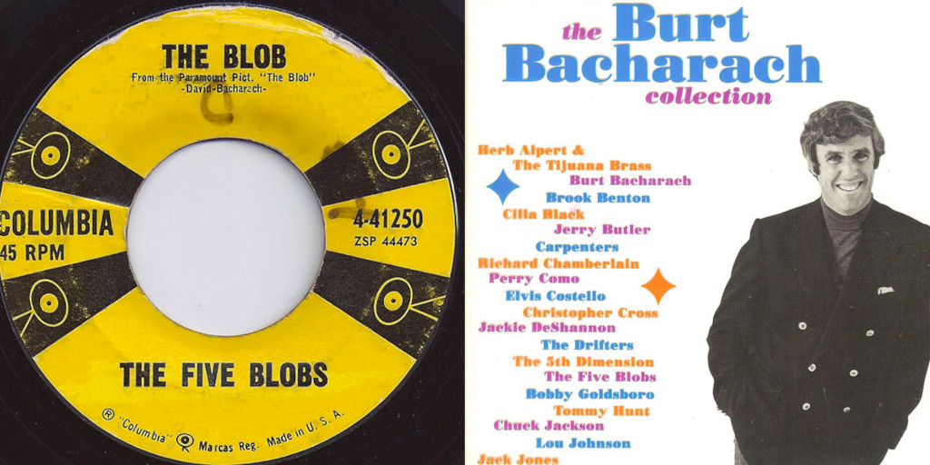 Another addition, albeit last-minute, was Burt Bacharach, an up-and-coming pop music composer, who was enlisted to write a song for the opening credits to replace the original credit theme by Carmichael. Harris decided that he wanted an up-tempo toungue-in-cheek pop song in the beginning to put the audience in the mood for camp, rather than for a traditional horror movie. Bacharach wrote the music, and the famous seven lines of lyrics were written by Mack David, brother of Bacharach’s frequent collaborator Hal David: “Beware of The Blob, it creeps / And leaps and glides and slides / Across the floor / Right through the door / And all around the wall / A splotch, a blotch / Beware of the Blob”. “The Blob” was recorded by a group of Los Angeles studio musicians who called themselves The Five Blobs. The band was led by Bernie Knee, who overdubbed his own vocals on the recording, making it sound like the song has multiple singers doing harmonies. The song became a minor hit and also helped the success of the movie.
