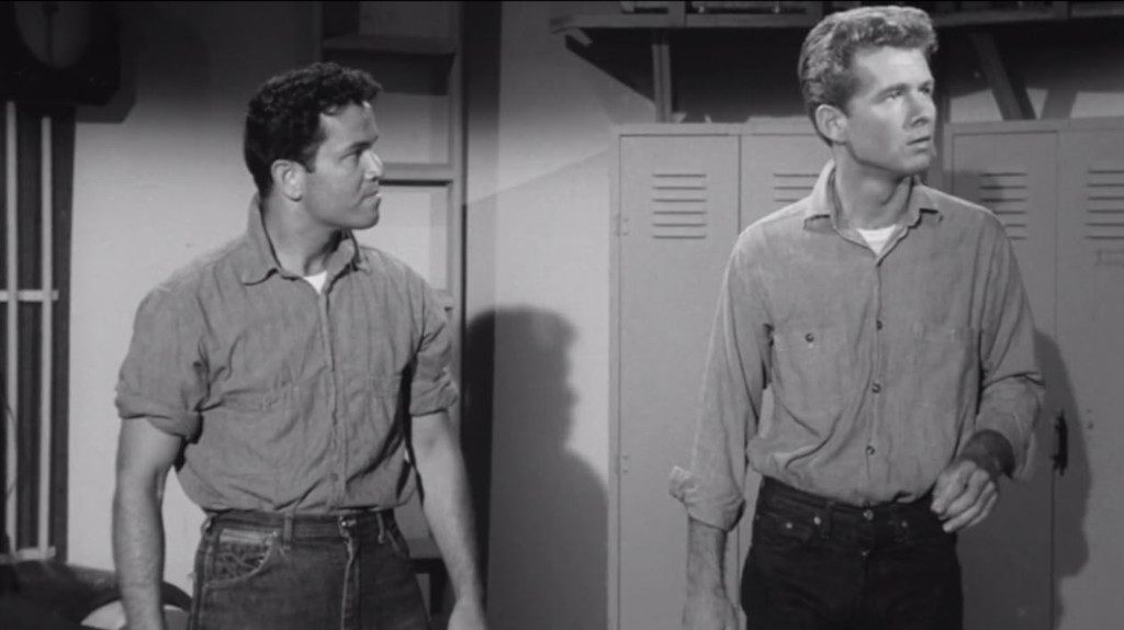 Clarke’s villainous co-escapee in Missile to the Moon (1958) is played by Tommy Cook, a former minor juvenile star, who rose to some fame in the serials Adventure of Red Ryder (1940) and Jungle Girl (1941). His dark features typecast him in “ethnic” juvenile roles in the 40s, often in minor parts or uncredited. His best known feature film appearance of the decade is probably as Kimba the jungle boy in the Johnny Weissmuller movie Tarzan and the Leopard Woman (1946), also featuring sci-fi regular Acquanetta. The 1950s began with a promise of better roles with a supporting turn in Fritz Lang’s American Guerilla in the Philippines (1950), as a Filipino resistance fighter during WWII. But his roles in A-movies, such as Elia Kazan’s Panic in the Streets (1950) and Billy Wilder’s Stalag 17 (1953), remained minor. His was fairly well employed during the decade, but had few leads even in B-movies, a rare exception being Columbia’s juvenile delinquency film Teen-Age Crime Wave (1955), in which he played the delinquent lead despite being closer to 30 than his teens.
