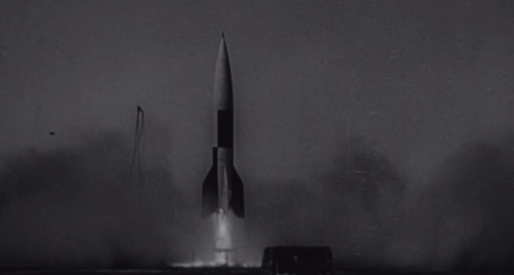 Technically the film is pretty much what you’d expect from a haphazard $65,000 production. The moon rocket is represented by two-dimensional, painted cardboard or plywood cutouts, and in one scene the duck tape seams are even visible. When it takes off it is transformed into a V2 rocket, and when it lands on the moon, it is simply a V2 takeoff in reverse, and you can clearly see the buildings of the launch site in the background. The marionette spider is naturally laughable. The “space suits” look like fighter pilot outfits with no chance for pressurisation.