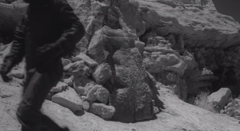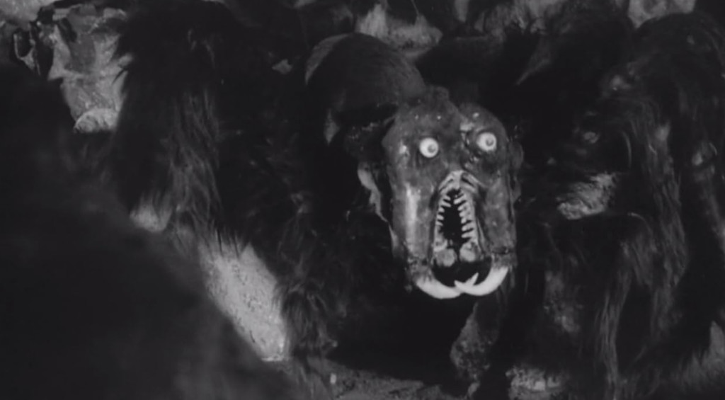 The questions keep heaping. What fugitive in his right mind would choose to hide from the authorities in the world’s first moon rocket? What moon rocket pilot in his right mind would place his life in the hands of two escaped criminals in the vague hope that they would not blow the whole spaceship to smithereens? Why did the moon maidens send all their remaining males on a Hail Mary trip to the Earth? Why are there torches made out of tree branches in the cave when there are no trees on the Moon? Where and how do the moon maidens grow their food? What do the rock monsters do when they are not chasing astronauts, and why are they chasing astronauts? Even taking into consideration that this is a film that was written up on the back of a napkin in order to make a quick buck, all the glaring logic inconsistencies, narrative cul-de-sacs and downright idiocies make it extremely hard to suspend one’s disbelief, or even follow the basic plot. Some scenes seem to be simply thrown in there for the sake of padding and plot convenience. The moon spider was never in the script – it was simply wedged in when Cunha discovered an old marionette spider is disrepair in Universal’s storage, that had been used for marketing Tarantula (1955, review).