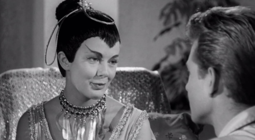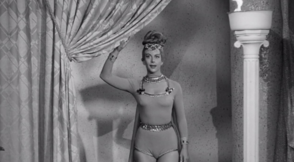 Laurie Mitchell, who plays the moon girl who falls in love with Tommy Cook’s character in Missile to the Moon (1958) is something of a fan favourite among friends of 50s science fiction B-movies. Born Mickey Koren, Mitchell was a juvenile model before entering acting under the moniker Barbara White, both in Playhouse theatre and in small roles in film and TV in the mid-50s. Her first movie role was as one of the pleasure girls accompanying Kirk Douglas in the beginning of Disney’s 20,000 Leagues Under the Sea (1954, review).