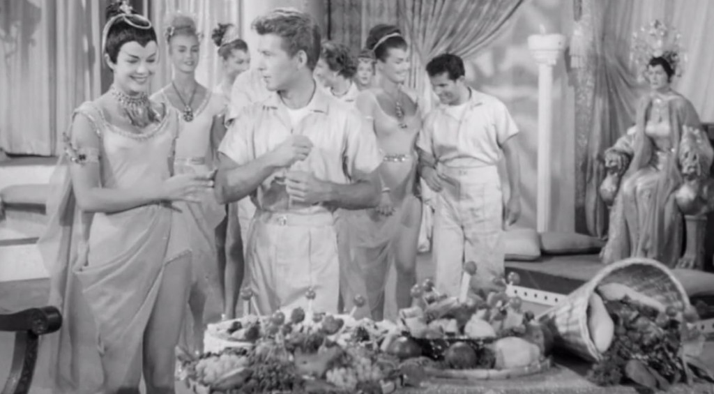 Despite the sun shining bright in the desert landscape, we learn that it is night, as the sunlight would burn the Earth people to a crisp. On their trek, they are attacked by rock monsters, and despite them wobbling along at a snail’s pace, they manage to trap our heroes in a cave, where they discover breathable air and a civilisation of women, led by the Lido (K.T. Stevens). It’s the usual rap. The women live in a pseudo-ancient-Greek society, and the women, who all look to be around 21, except the older Lido, have lost their men in some way that is never quite explained. The guests are wined and dined, and Gary jumps straight to seducing one of the girls.