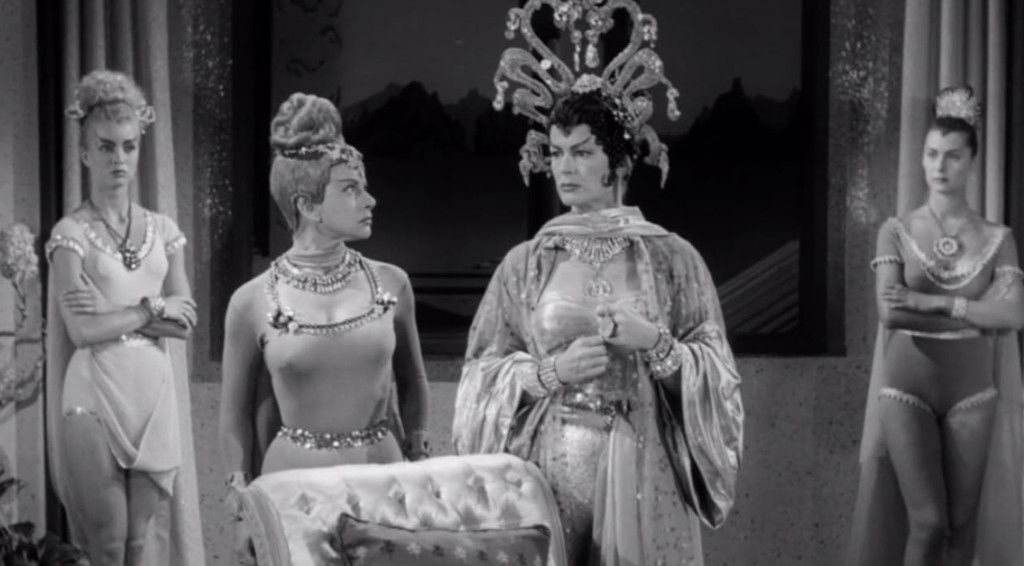 The wondefully hammy villain Alpha in Missile to the Moon is played by Italian-American Nina Bara. Born in Buenos Aires, she was cast in minor roles as Latinas during her early Hollywood career in the second half of the 40s in films such as The Mummy’s Curse (1944), Yolanda and the Thief (1945), Gilda (1946) and A Lady Without a Passport (1947). Most of her around a dozen roles where minor or uncredited. However, she became a fixture on TV as part of the heroic space-faring crew, as Miss Tonga, on the hugely popular children’s show Space Patrol, which ran between 1950 and 1955. Her role as Alpha in Missile to the Moon (1958) was her only feature film after the show went off air. After her acting career, Bara became a librarian.