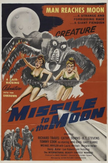 Missile to the Moon. 1958, USA. Directed by Richard Cunha. Written ny H.E. Barrie, Vincent Fotre. Starring: Richard Travis, Cathy Downs, K.T. Stevens, Michael Whalen, Nina Bara, Tommy Cook, Gary Clarke, Laurie Mitchell, Leslie Parrish. Music: Nicholas Carras. Cinematography: Meredith Nicholson. Editing: Everett Dodd. Set decoration: Harry Reif. Costume design: Marjorie Corso. Makeup: Harry Thomas. Produced by Marc Frederic for Layton Film Productions & Astor Pictures Corporation.
