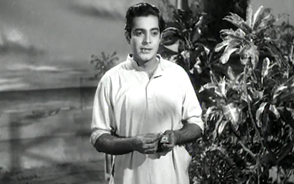 Indian cinema had flirted with science fiction previously, and produced a handful of movies that, like Maya Manithan, can only very generously be considered part of the genre. Two of them, Professor Waman, M. Sc. (1938) and Flying Prince (1946) involve an evil scientist concocting devious potions, and as far as I can tell from titles and taglines, Jadui Bandhan (1941) and Aaj Aur Kal (1947) seem to deal with some sort of time travel or perhaps seeing into the future or something alike, but I really can’t tell, since I can’t find any information on them online. The afore-mentioned The Jungle (1952) barely scrapes by into SF territory with its overwintered woolly mammoths. Maya Manithan is also very low on science and rather high on drama, and the invisibility potion seems more a gag than anything the film revolves around. In fact, it would not have been difficult to write out the invisibility altogether and to have come out with pretty much the same film in the end.