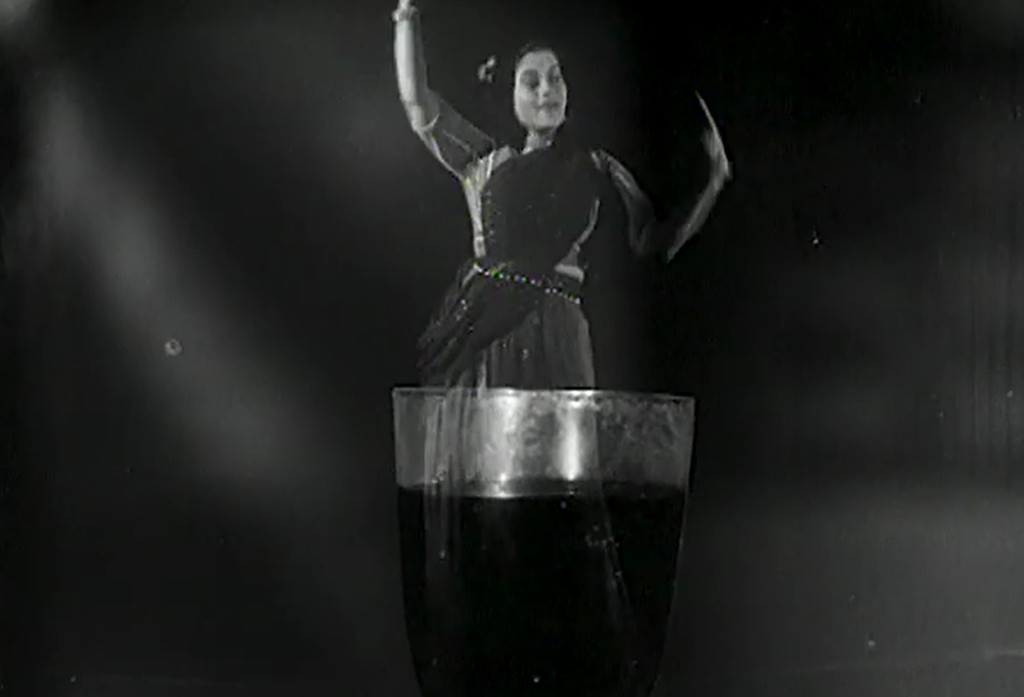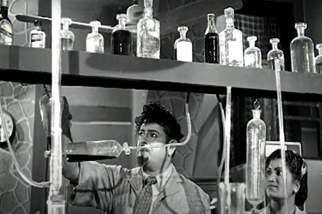 Later, while watching a dance and song performance by the fabulous T.P. Muthulakshmi, Ashokan pours poison into the wine glass of a man he has invited to his house, and then bribes Muthulakshmi into coercing Sriram to enter the room with the dead man. Ashokan has her call the police in order to frame Sriram for murder. But Sriram tricks Ashokan into opening the door, and a fistfight ensues. The police arrive and Sriram escapes into the streets of, presumably, Salem. He sneaks into a house and realises he has entered the abode of the local mad doctor, who hovers over a table full of beakers and bubbling fluids. He produces a potion which he feeds to his dog — making the dog invisible! When the doctor and his assistant exit the lab, Sriram sees his chance for revenge, and gulps down the invisibility potion — and it works!