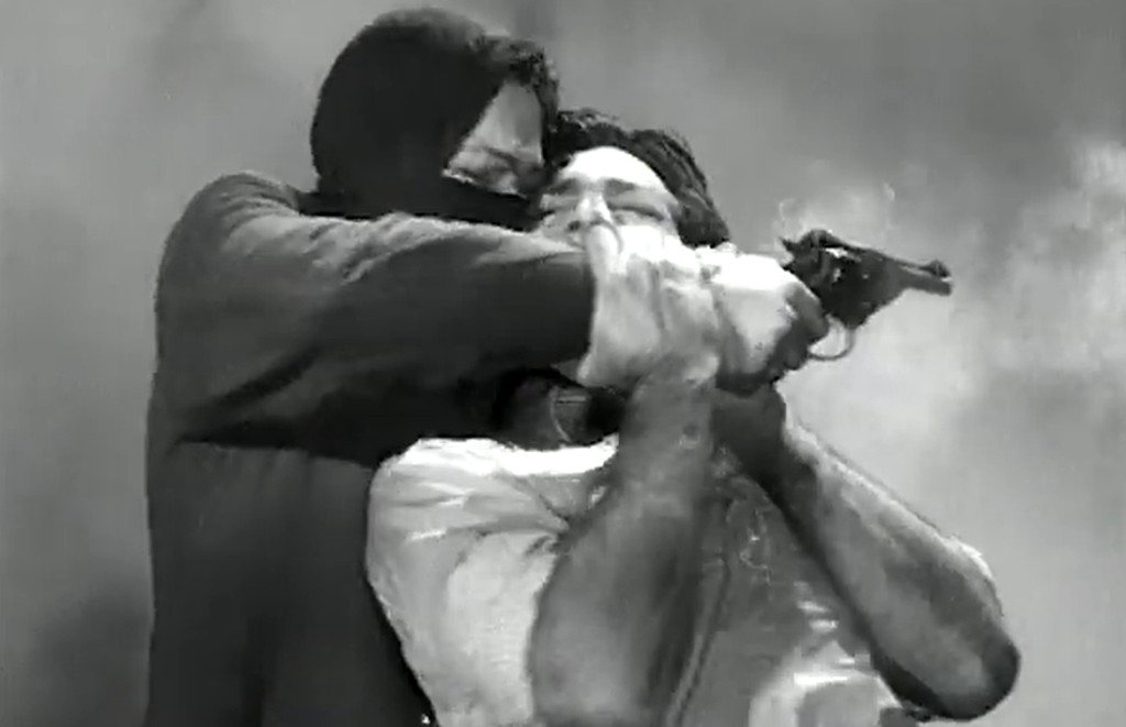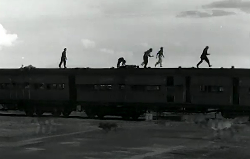 After this, the film picks up steam considerably, and even if I don’t quite understand what is going on, I am very entertained by the well-staged and often well-shot action and fight scenes. A second villain (G.M. Basheer) is introduced, but how he figures into things I have no idea. There are three major fighy scenes, in which Sriram, in bandages and fedora, takes on multiple henchmen at a time. The most impressive one is perhaps one in which the pugilists demolish an entire restaurant, with Sriram front-flipping over tables, throwing baddies through windows and engaging in all sorts of acrobatics. Another one, toward the end, has him fighting henchmen on the roof of a moving train. Finally, he confronts Ashokan in a fight in a mountainous landscape, when Ashokan is accidentally shot by one of his own henchmen. With his dying breath, he seems to confess to the police, and the mad scientist kindly shows up with an antidote to the invisibility potion so that Sriram and Chandrakantha can live happily ever after.