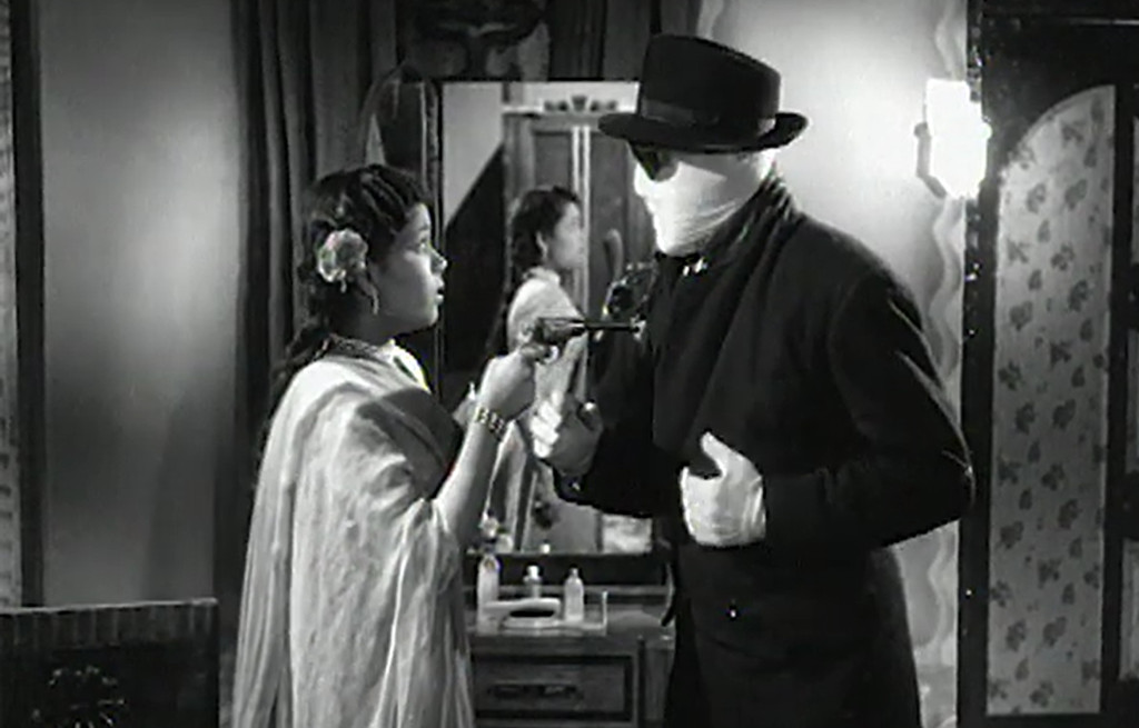 The rest of the plot is quite confusing for me, as there’s a lot of talk, different characters apparently double-crossing each other and fighting it out, and I can’t really make out who is who and what the underpinnings of the conflicts are. The main theme, however, is that after making himself invisible, Sriram dons the classic Claude Rains look of a bandaged head, sunglasses and a fedora, and this is how we will see him for most of the rest of the movie. He at one point visits Ashokan, with what purpose I do not know, but they have a brief discussion, and Sriram finds a confidante in a young woman (Chandrakantha), who seems to be a part of the Ashokan household. She is the leading lady of the movie, who hooks up with Sriram in the end. Eavesdropping on them, Ashokan learns that the bandaged man is really Sriram. In order to get him in trouble, Ashokan and a couple of henchmen dress up in the same way as Sriram and execute a number of robberies across town, and now the police are looking for a man looking like Claude Rains in The Invisible Man.