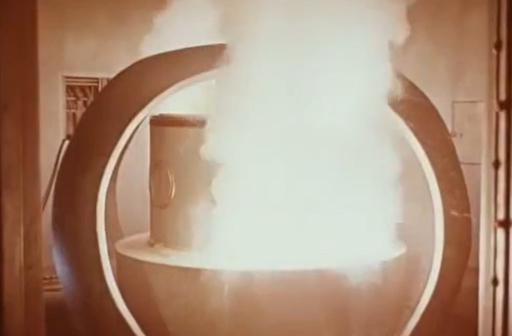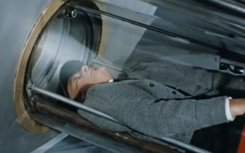 The science if befuddling. Of course, there’s the idea that one could survive being shot out of a cannon at the velocity required to travel beyong Earth’s gravity, an idea even Jules Verne knew to be faulty – even if he devised ways to get around the problem in the novel (he had the passengers suspended on a “raft” in a water container to cushion the blow). In the film, the screenwriters have come up with a bonkers idea that the way to overcome the shock of being fired out of a cannon is to be rotated in a tube revolving 12,000 times a minute, all while in suspended animation. What kind of physics are involved in this solution is never explained. Much is made of the giant gyroscope – which is only there to “compensate for gravity”, as if a gyroscope could create artificial gravity. For some reason, when the nuclear reactor starts to melt, all the passengers’ – spring-operated – watches stop, as if radiation would affect the mechanical springs. At the finale, Barbicane and Nicholl contemplate that the reactor meltdown will cause the rocket to disintegrate. However, they reason, if the explosion is powerful enough, it will not cause the rocket to disintegrate, but somehow neatly detach all the four compartments of the rocket, that just so all happen to have functioning landing thrusters. This, again, is a train of physics that probably can’t be explained by anyone save the screenwriters.