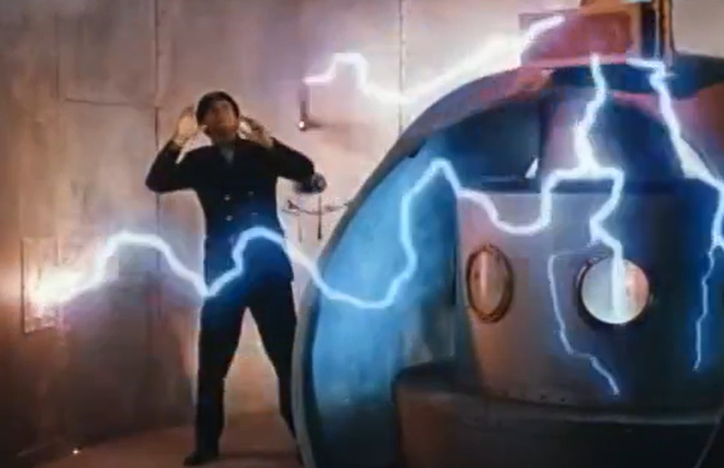 The practical effects – I should write: those that are tied to the spaceship interiors – are quite impressive, from the giant gyroscope to the rotating “acceleration tubes” and that odd orb with neon lights. But that’s where it stops. The asteroids on display outside the observation room’s window are rather disappointing sparklers, and the scenes of the rocket taking off seem to have been completed in an extreme hurry. The model rocket itself looks quite nice, but it is only ever filmed from a single angle, against a blue sky during “takeoff”. There’s never any sense of movement, and the rocket is clearly stationary the whole time – kept in place by a clearly visible support rod (it is possible this rod was hidden in the film’s theatrical widescreen presentation format). Furthermore, the flames and smoke billow up across the rocket and not downward as they would if the rocket was fired into space. This is an amateur mistake: even the cheapest of the B-movie directors knew to turn the rocket upside-down and then turn the film strip 180 degrees in editing as to simulate the flames going downward. The same unedited images ofthe rocket against a blue sky with flames rising up and over it are used at one point when it is supposed to be in the darkness of space. As for visual effects, they are almost nonexistent, save for some cel animation of electrical arcs. If the special effects are not up to specs, it is not because a lack of know-how. They were designed by Lee Zavitz, who had headed the special effects crew on Around the World in Eighty Days.
