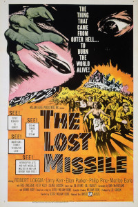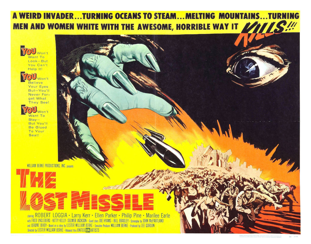 The Lost Missile. 1958, USA. Directed by Lester Wm Berke. Written by Lester Wm Berke, William Berke, John McPartland, Jerome Bixby. Starring: Robert Loggia, Ellen Parker, Phillip Pine, Larry Kerr, Marilee Earle, Fred Engelberg, Kitty Kelly, Selmer Jackson, Hari Rhodes, Viola Harris, Lawrence Dobkin, Robert Shayne. Music: Gerald Fried. Cinematography: Kenneth Peach. Editing: Everett Sutherland. Set designer: William Ferrari. Sound: Jack Solomon. Special effects: Jack Glass. Makeup: Allan Snyder. Produced by William Berke & Lee Gordon for William Berke Productions & United Artists.