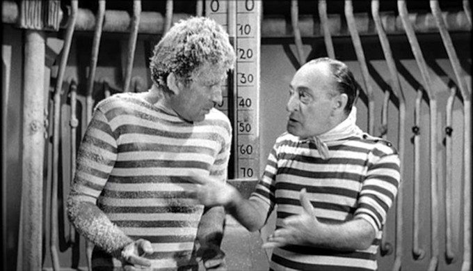 Other films are more clearly referenced in the plot. Of course, the pod people and the duplicates represent a spoof of Invasion of the Body Snatchers (1956, review), and in general Totò nella luna references the cold war space race subgenre, complete with a shady communist agent and his femme fatale sidekick trying to sabotage West’s space programs and/or steal secrets. Destination Moon (1950, review), with its genre-defining take on the first attempted moon flight is sometimes mentioned as a source of inspiration. The film I think it mostly resembles is Roger Corman’s War of the Satellites (review). The similarities are almost uncanny. Both films feature aliens interfering with Earth’s attempts at conquering space through asserting some mysterious force over rockets launched into space. In both films alien duplicates of astronauts are created in order to sabotage the space flight, and in both films the aliens communicate to Earth with animated spirals and grave voices speaking from the void. War of the Satellites didn’t premiere in Italy until November, 1958, but is it possible that Steno or Fulci might have read a review of the film in a trade magazine before it premiered? There’s a fairly long scene with Achille and Pasquale stuck in a freezer, preparing for the chill of outer space, which according to Ennio Bispuri’s book Totò principe clown is simply a rehash of a scene in another Totò movie also scripted by Steno, Due cuori fra le belve (1943). As Phil Hardy points out in The Encyclopedia of Science Fiction Movies, even the setup of a mild-mannered author trying to get his stories published in his magazine run by a despotic editor seems to be lifted from another film, namely Jean Renoir’s The Crime of Monsieur Lange (1936).