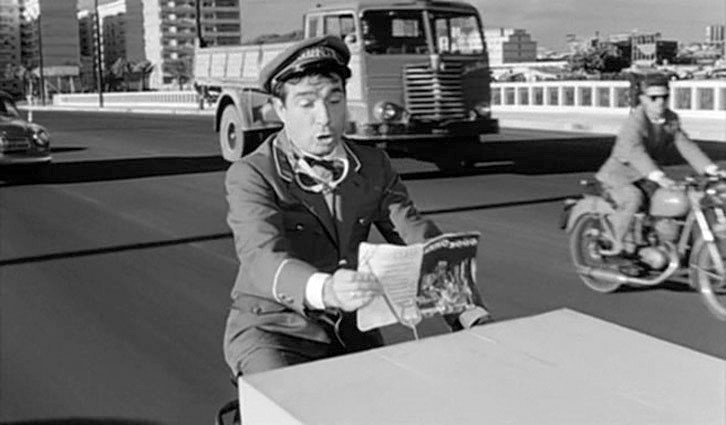 Aliens (represented by animated googly-eyes) are sabotaging America’s attempted moon missions – the last one attempted with a chimp as an astronaut. The US scientists are oblivious to the extraterrestrial meddling, and scratch their heads trying to figure out what keeps going wrong. What is needed, they think, is a human pilot. But this seems impossible, as humans can’t withstand space flight. Enter Achille Paoloni (Ugo Tognazzi), a dim-witted but amiable delivery boy for Italian men’s magazine Soubrette — and wannabe science fiction writer.