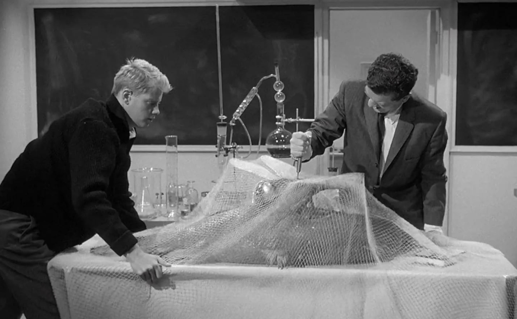 Anthropology professor Donald Blake (Arthur Franz) is giddy as a school boy when he gets a delivery from Madagascar in the form of a recently deceased coelacanth fish – a so-called “living fossil”, which he intends to research and use in his lectures about evolution. But little does he know that the now thawing fish carries a bacteria that causes any creature infected with it to undergo reverse evolution. And we all know what that means …