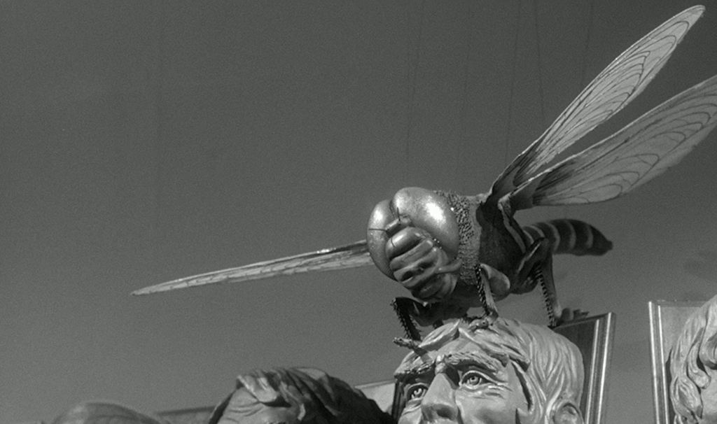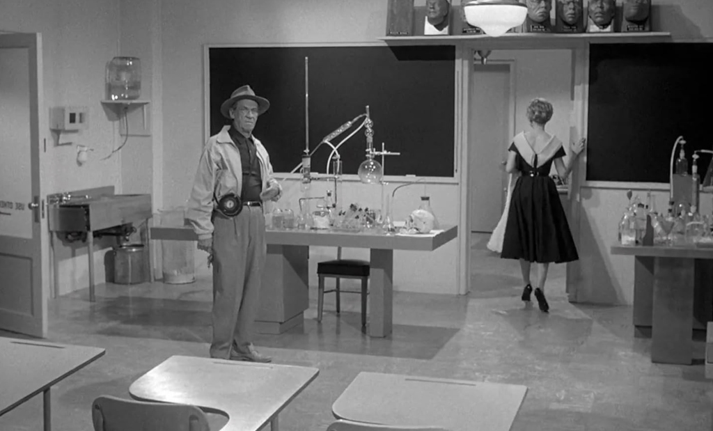 The taglines of the poster leaned heavily into the teen market: “Co-ed beauty captive of man-monster”, “Students victims of terror beast!”. In fact, students or teenagers hardly play into the plot in any way, which is in and of itself an achievement of sorts for a film based on a college campus. The only teens in the picture are Jimmy and his girlfriend, and none of them are ever captives of a man-monster nor victims of a terror beast. The only thing that attacks them, barely, is a dragonfly. And really, it’s more an annoyance than an attack. The two teens are so redundant they could have been entirely taken out of the movie without any consequence on the plot.