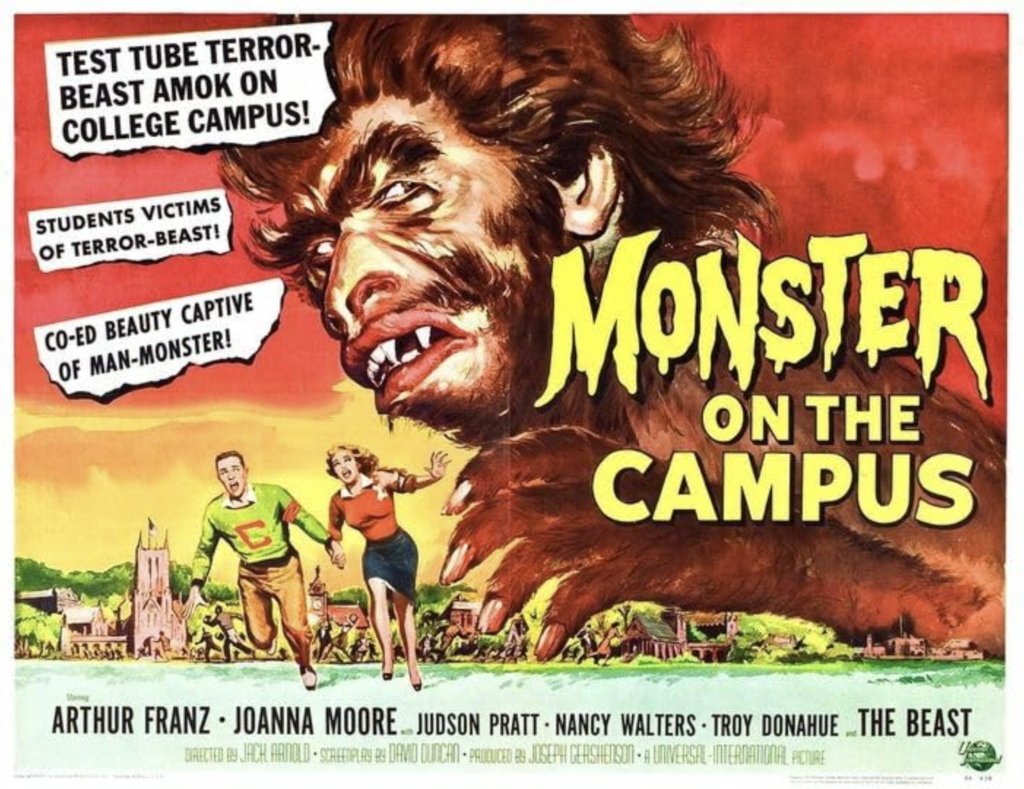 Monster on the Campus. 1958, USA. Directed by Jack Arnold. Written by David Duncan. Starring: Athur Franz, Joanna Moore, Troy Donahue, Nancy Walters, Eddie Parker. Produced by Joseph Gershenson. IMDb: 5.8/10. Letterboxd: 2.9/5. Rotten Tomatoes: N/A. Metacritic: N/A.