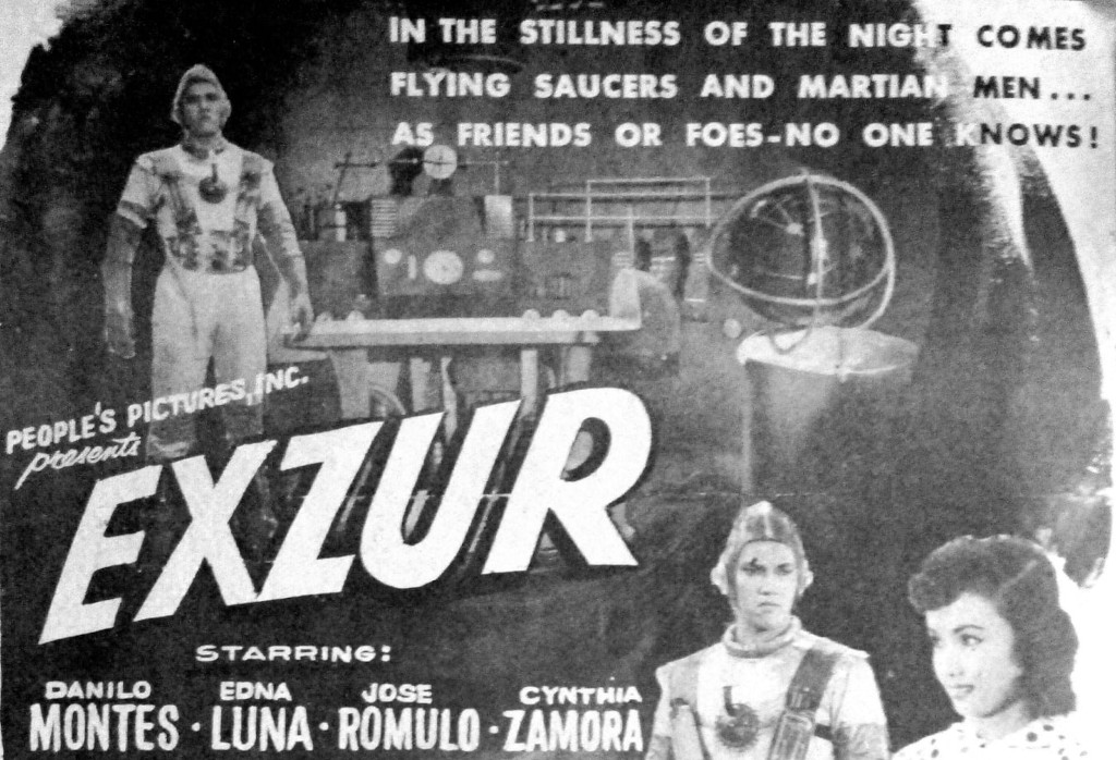 Next up, also in 1956, was the alien invasion movie Exzur, written both for the screen and for the comic serialisation by Nemesio E. Caravana, and diected by Teodorico C. Santos. Every plot synopsis I have read feature nothing but the same blurb from film scholar Victor Ocampo, stating that the film “featured the dramatic destruction of Manila’s City Hall, the Bureau of Posts building and Quezon Bridge by an armada of flying saucers”.