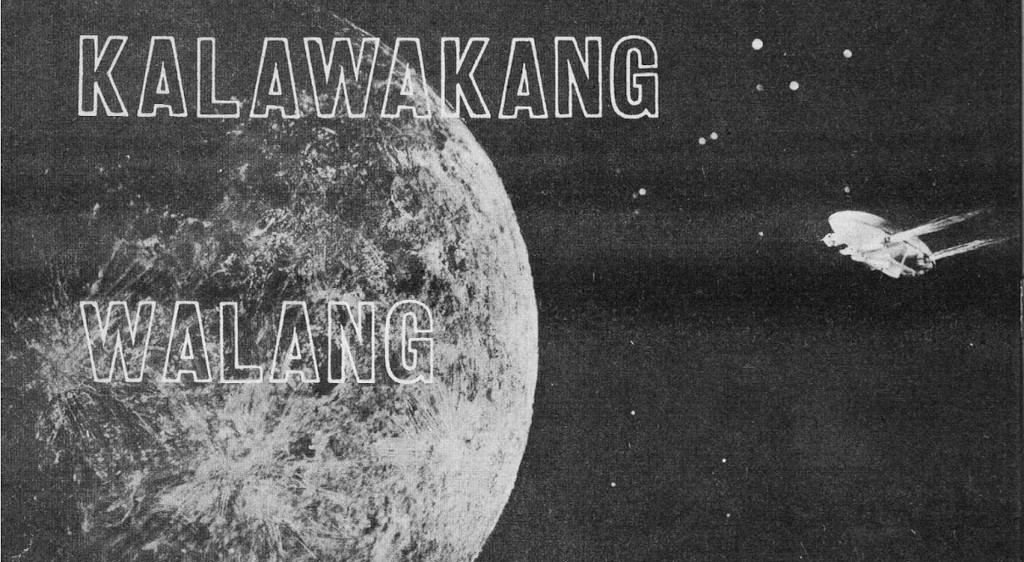 The best information I can find about the film comes from a cutout from an old Filipino film magazine called Literary SONG MOVIE Magazine, that has been provided by the Pelikula, Atpb blog. The spread is clearly a promotional ad for Zarex. I ran the cutout through Google Translate, which didn’t really get me a lot of information, as most of the text is basically placeholder text speaking of the wonder of travelling to other worlds. It’s clearly a promotional article written by the magazine based on the images provided by the studio and a brief advertisement blurb. However, there is a line which says that the film is about a crew on a spaceship that travels to another planet inhabited by other types of creatures. The text is accompanied by a photo of lead actor Willie Sotelo in a space suit standing by a window of a spaceship looking out at another spaceship, with the edges of mountains seen at the bottom of the window. On the other side of the window stands a humanoid creature with a decidedly alien-looking head. Other pictures show Sotelo standing in a field with a spaceship behind him, and what looks like concept art for an alien city. However, there is also available a magazine ad that clearly states that this is a film about a moon landing, and not about travelling to another planet. Thus, this is a film about Filipino astronauts encountering aliens on the moon. This helps us at least place the film in a setting, but says little about the actual plot.