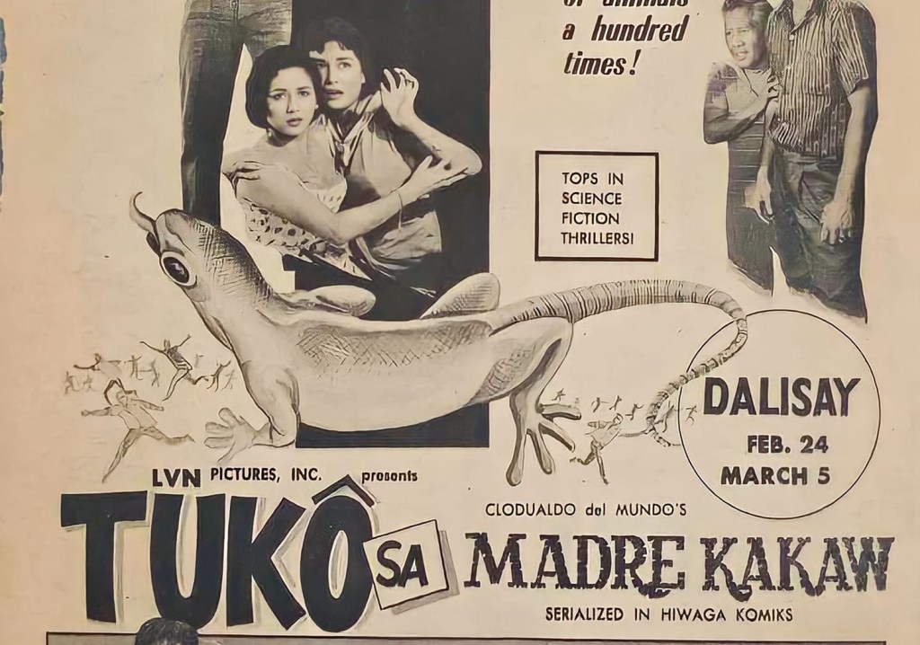 The script for the Tuko sa Madre Kakaw was adapted from a 1958 comic by Clodualdo del Mundo Sr, published in Hiwaga Komiks. As far as I can tell, the film follows the komik rather faithfully. Sci-fi scholar Victor Ocampo describes the story as one of the best science fiction and komiks entry of the era. The plot, as far as I can tell, is rather derivative of other pulp and Hollywood stories of the era, but does incorporate elements of Philippine folklore and myth – such as the gecko’s ominous cries as a herald of bad omens.